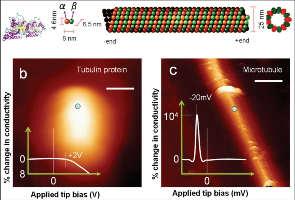 Here's a diagram illustrating tubulin structure, microtubule assembly, and conductivity changes relevant to quantum effects: