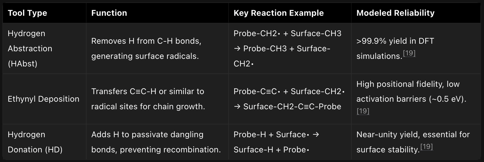 The core toolkit identifies three primary tool classes: hydrogen abstraction tools to create reactive radical sites by removing hydrogen atoms from passivated surfaces; carbon deposition tools to add carbon atoms or moieties (e.g., methyl or ethynyl groups) in specific configurations; and hydrogen donation tools to terminate and stabilize newly formed bonds. Freitas and Merkle expand this to a set of nine specific tools in their 2008 analysis, including undoped variants for basic operations and doped variants (e.g., with nitrogen or boron) for enhanced selectivity or error correction, allowing bootstrapping from bulk diamond tips to self-replicating assemblers. Reaction pathways, such as abstracting H from a -CH3 terminated site followed by ethynyl (C2H) deposition and H donation to form sp3 carbon bonds, are modeled to proceed with minimal diffusion or side reactions under cryogenic conditions (e.g., 100-200 K) to suppress thermal noise.