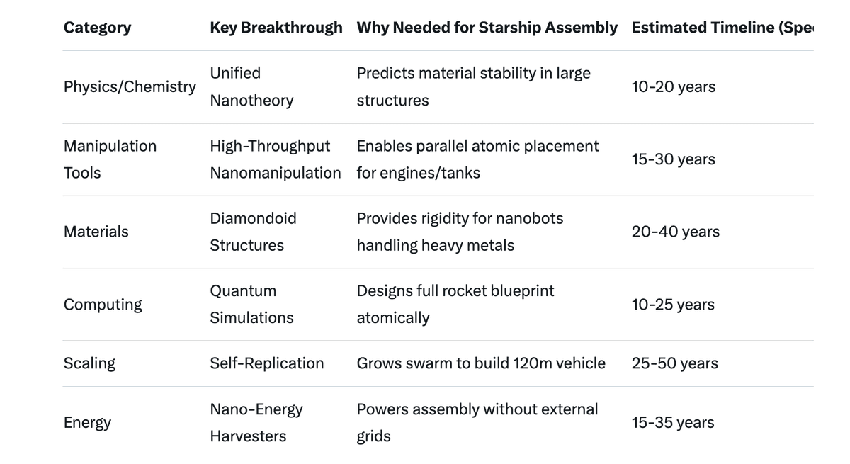 Assembling a massive structure like SpaceX's Starship using molecular nanotechnology (MNT) would require transforming speculative concepts into practical engineering. MNT, as envisioned by pioneers like K. Eric Drexler, involves programmable nanobots or molecular assemblers that manipulate atoms and molecules to build complex objects bottom-up, with atomic precision. While current nanotechnology excels in areas like drug delivery and semiconductors, scaling to macroscopic manufacturing (e.g., a 120-meter rocket) demands breakthroughs across physics, chemistry, materials science, computing, and systems engineering. These aren't just incremental improvements but paradigm shifts, potentially taking decades. Below, I detail the key breakthroughs needed, grouped by category for clarity. This draws from expert analyses of MNT challenges, emphasizing the gaps between today's lab-scale demos and industrial-scale reality.