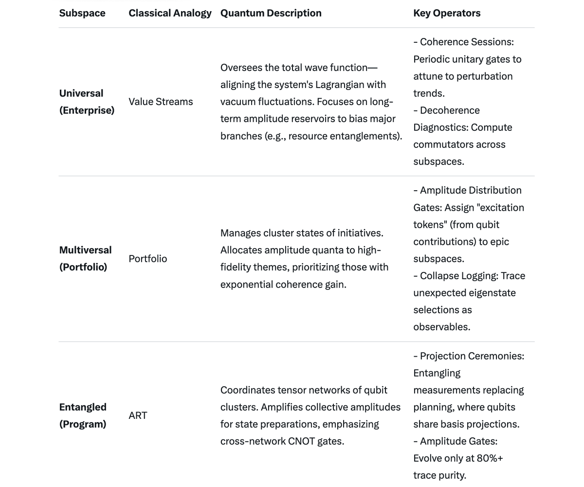 is the Hamiltonian operator). Random or predefined cadences in traditional frameworks (like SAFe) introduce decoherence—environmental interactions that collapse superposition prematurely, leading to suboptimal, classical outcomes where ψ is the wave function and H^ is the Hamiltonian operator). Random or predefined cadences in traditional frameworks (like SAFe) introduce decoherence—environmental interactions that collapse superposition prematurely, leading to suboptimal, classical outcomes. In contrast, CHF's bliss accumulation fosters a coherent superposition of possibilities, where practices like meditation or gratitude rituals minimize entropy (disorder) and amplify amplitude in desirable state vectors. This increases the probability density (|ψ|^2) for favorable outcomes to "appear," akin to how laser light (coherent photons) emerges from stimulated emission rather than random scattering.