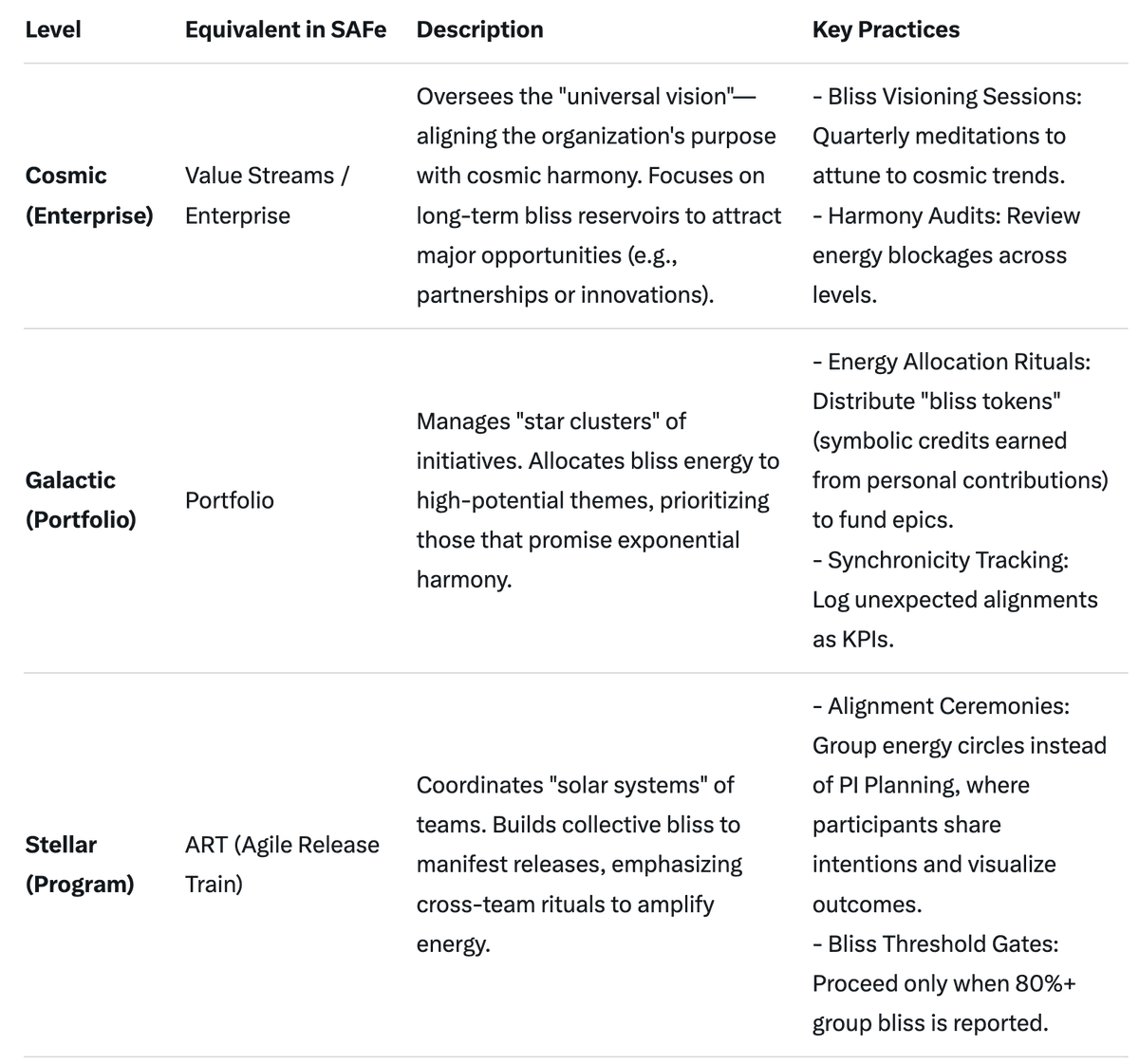 Universal Alignment: All actions must resonate with the greater cosmos—ethical, sustainable, and interconnected. This replaces SAFe's lean-agile mindset with a "harmonic mindset," where decisions are vetted against questions like: "Does this amplify collective bliss or disrupt equilibrium?"