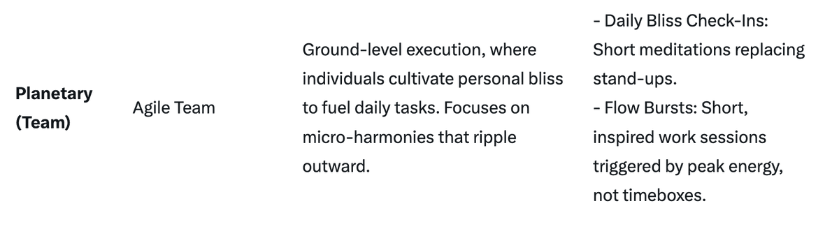 Emergent Flow: No fixed cadences like PI Planning in SAFe. Instead, cycles begin and end based on bliss signals (e.g., group consensus on "energetic readiness"). This allows for non-linear progress, where the "best possible outcome" emerges naturally, guided by intuition and cosmic timing.