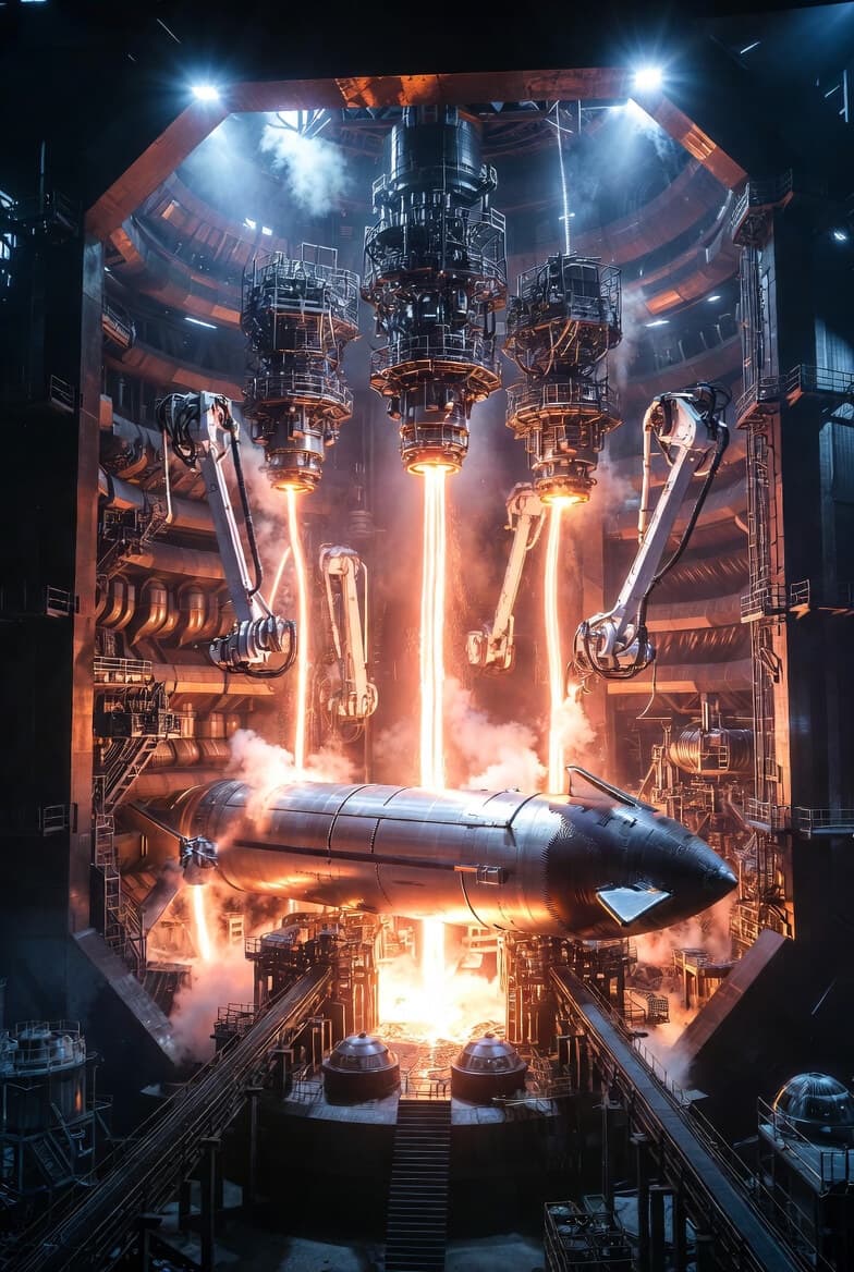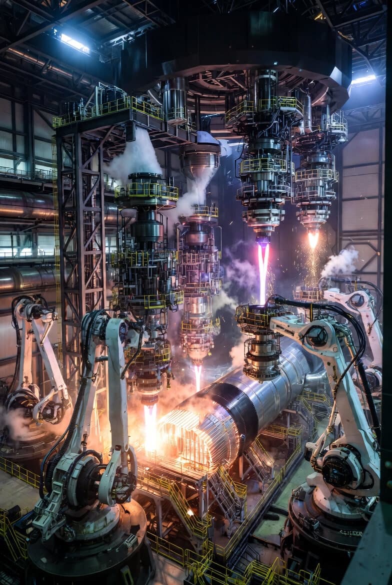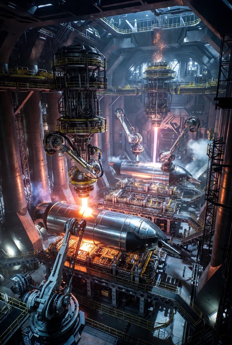 - Physical footprint — The entire "printer" occupies a covered industrial hall or semi-outdoor structure the size of several football fields (e.g., 300+ m × 100 m), with massive overhead gantry cranes, linear rails spanning the length, and climate-controlled shielding (inert gas atmosphere to prevent oxidation in stainless/cryo alloys).