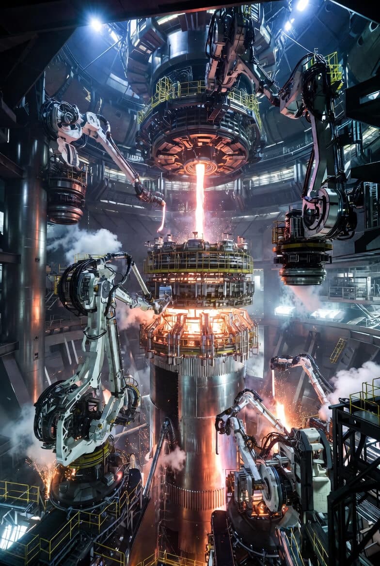 - b) AI-orchestrated flow: Raw metal feedstock → high-speed printing → robotic heat treatment/machining → bot assembly lines → automated engine integration → full-stack rollout in days.