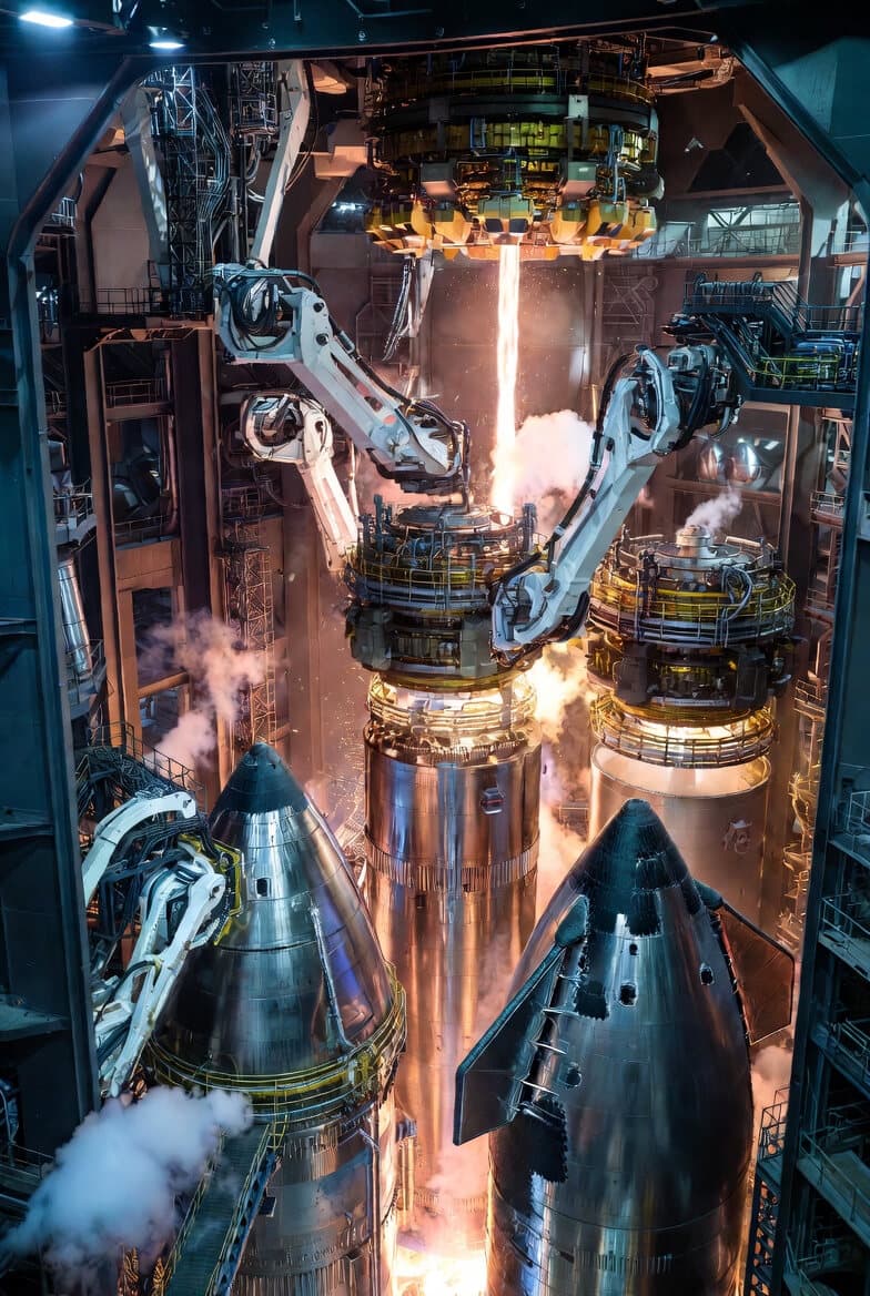 - Robots assemble stages, integrate 3D-printed Raptor-like engines (already possible monolithically at smaller scale), add flaps/heat shield tiles.