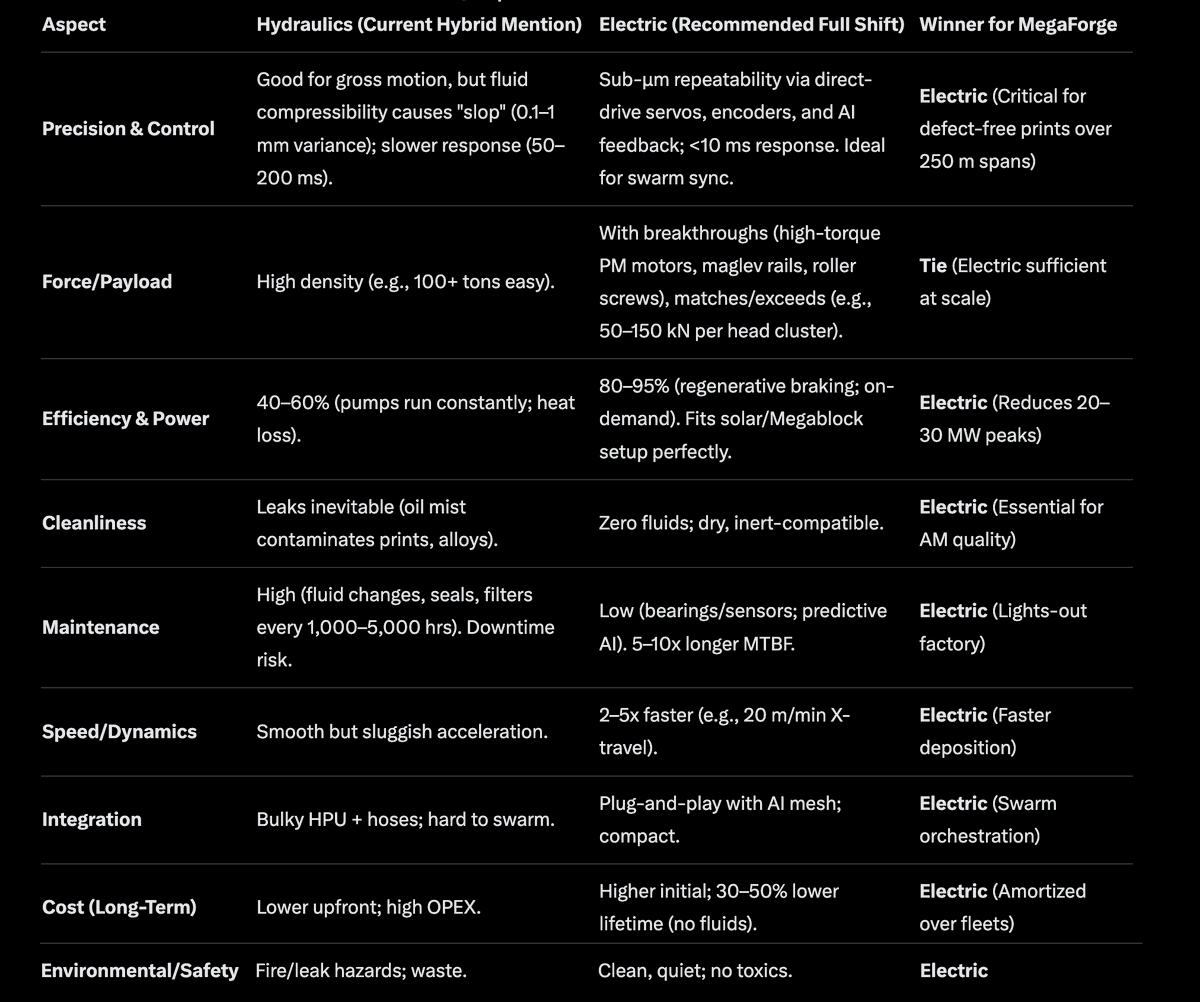 Key takeaway: Hydraulics shine in brute-force, low-precision heavy equipment (e.g., excavators), but for MegaForge's precision manufacturing at extreme scale, electric eliminates failure modes, boosts uptime, and leverages AI/digital twins for flawless operation. The 2030s breakthroughs (e.g., compact 100 kW+ torque motors, zero-wear maglev) close any force gaps.