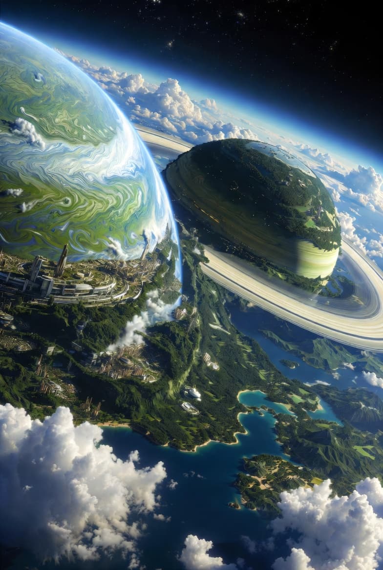 - Atmospheric Engineering: MNT floating factories extract D/He-3 while building vast aerostat biospheres or "cloud continents" with engineered buoyancy and ecosystems. Fusion stabilizes platforms against winds.